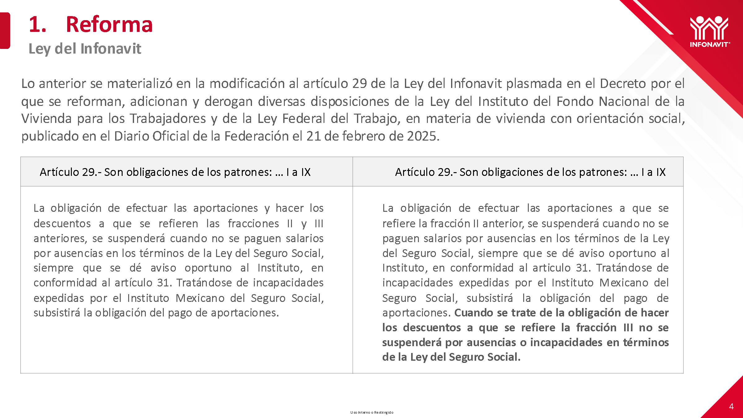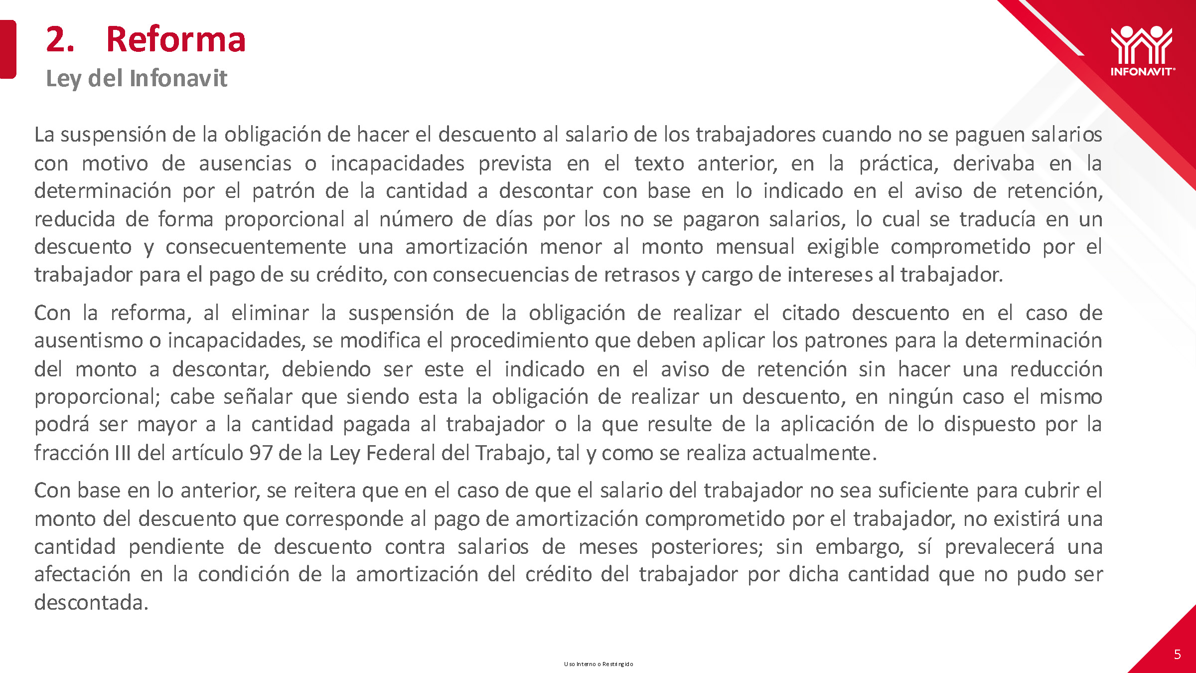 A partir de la reforma publicada en el Diario Oficial de la Federación el 21 de febrero de 2025, los patrones tienen nuevas obligaciones respecto a los descuentos salariales para créditos de vivienda. Ahora, dichos descuentos no se suspenden por ausencias o incapacidades, asegurando que los pagos comprometidos sean más constantes y evitando retrasos y acumulación de intereses para los trabajadores. Además:
